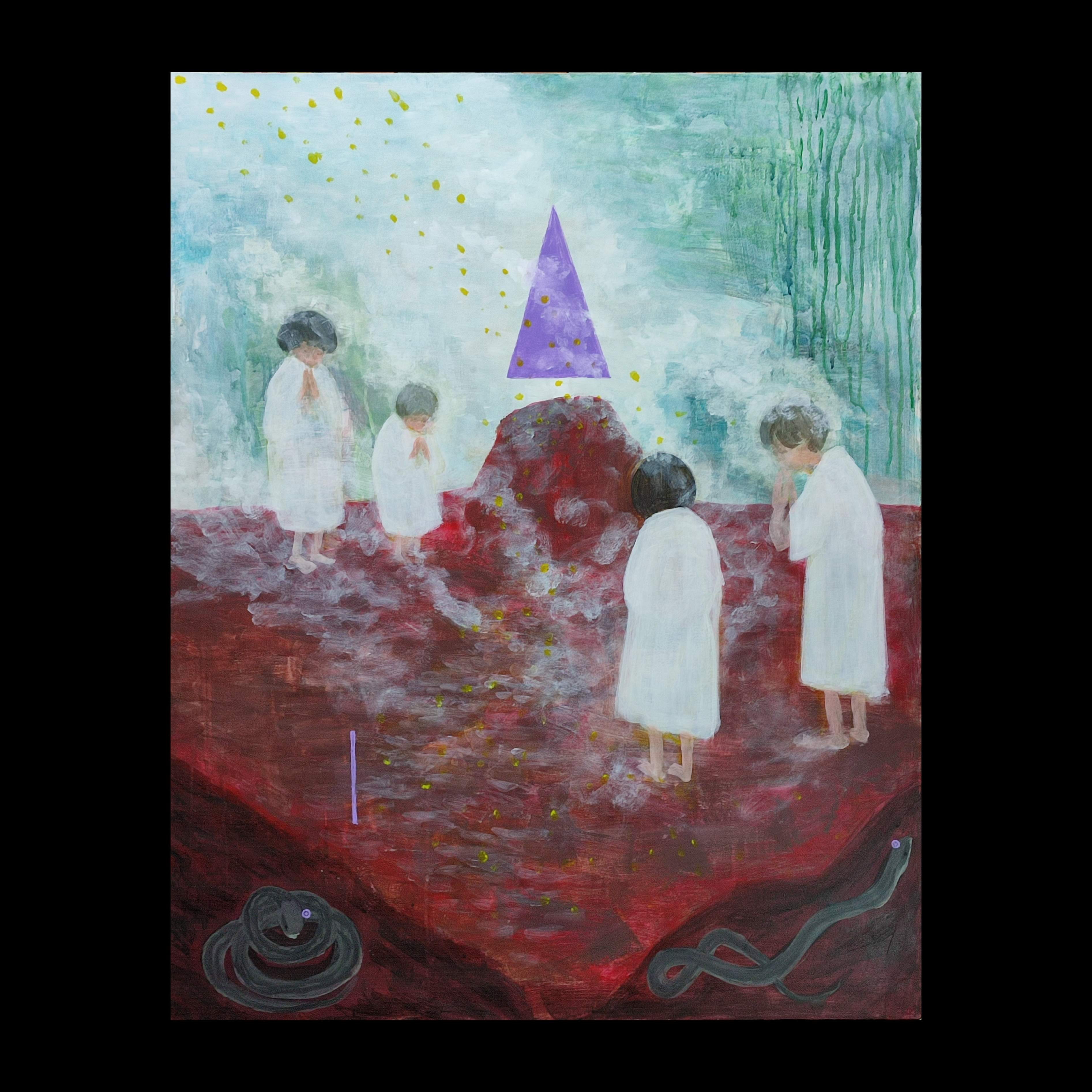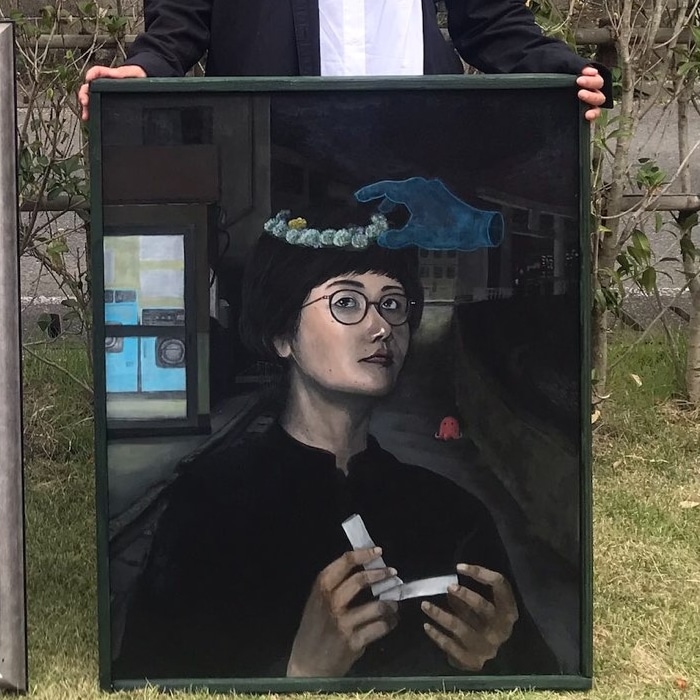 第58回大分県美術展入選『無名の継承』前の作品『デカいおじぎ』から継承された花輪。生きてるとけっこう先輩方からなにかスピリット的なものを継承しているな、と感じることがある。そういう絵。